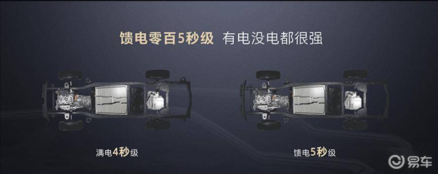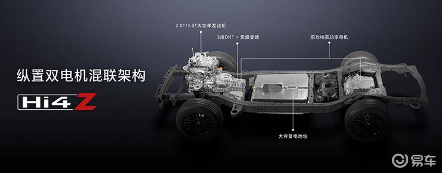 At the same time, compared with Hi4, its performance is stronger. Hi4-Z uses P2+P4 dual-motor layout, in which P2 motor is both power generation and driving, P4 motor is driven at the rear axle, and the engine has 2.0T and 3.0T options, matching a self-developed vertical 3-speed DHT gearbox, which can adapt different gears according to different road conditions. Under this system, the comprehensive power of the vehicle can reach 715kW, and the three power sources simultaneously exert their power, which can realize 4s-class zero-hundred acceleration! At the same time, the Hi4-Z is also a decoupled off-road architecture that can be directly driven by a full-speed engine. The engine can be involved in driving at any speed, and even if it is fed, it can still achieve 5 s-class zero acceleration.